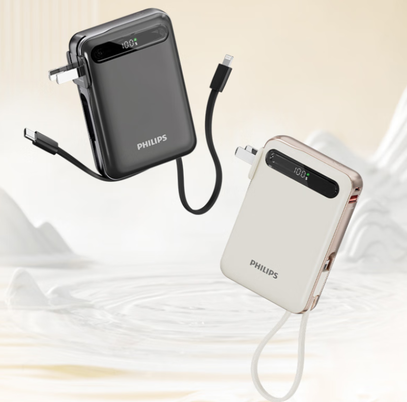 > 飞利浦三合一充电宝3C认证可上飞机自带双线插头10000毫安小巧便携22.5W快充大容量移动电源