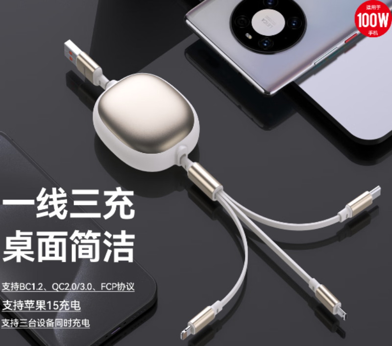 商品名称:纽曼(Newmine)纽曼XS22三合一伸缩数据线 100W超级快充手机全兼容 5档调长+智能回弹 合金接口1.15米 耐用快充线