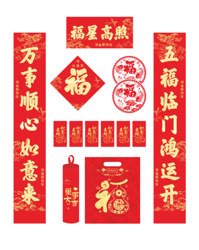对联:150x25cm(128g书法红) 横批:53x24cm(128g书法红)