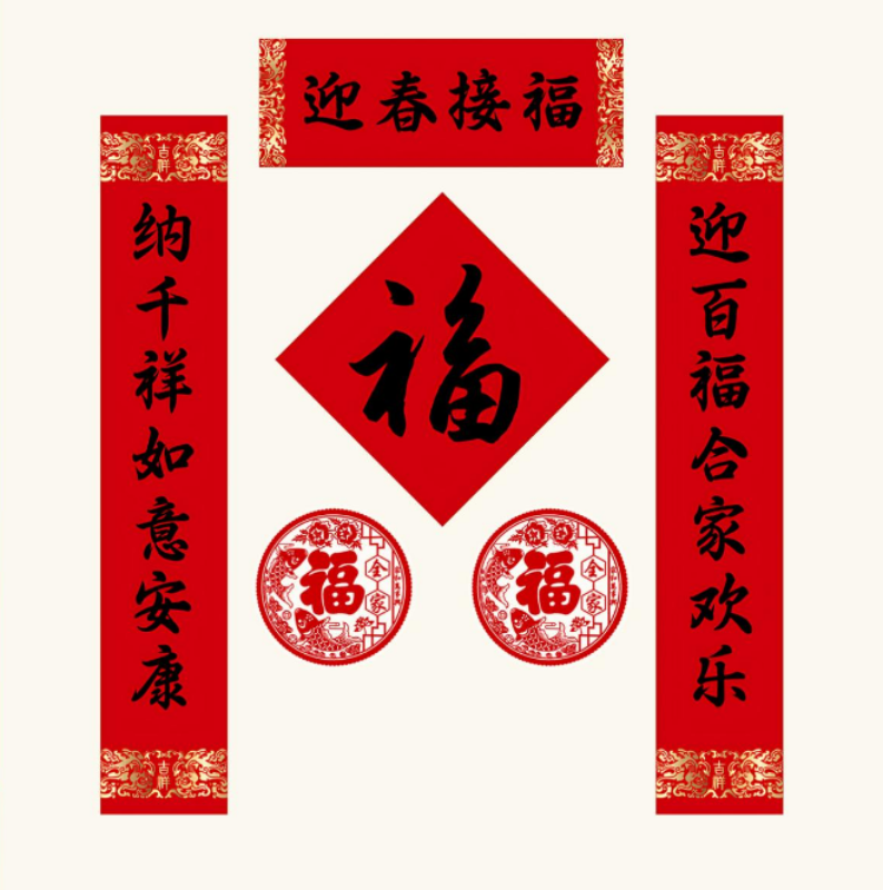 对 联 1 幅:118X21cm 157克铜版纸,特殊高档仿绒烫黑金中国红